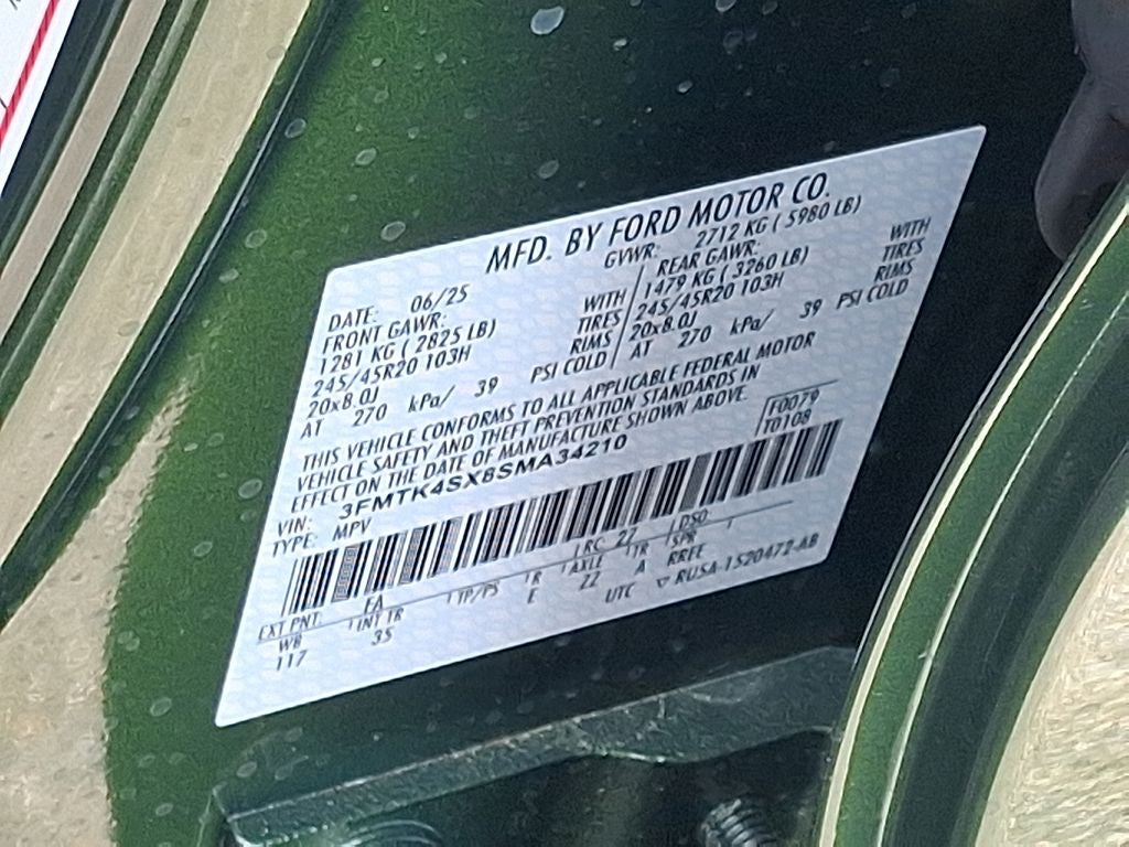 Bronze Appearance Package: Bronze Mesh Front Grille Shield; mach-E 4x Door Badges and Rear Gt Badge. Interior Protection Package: Cargo Floor Liner; Cargo Area Cover; 1st and 2nd Row Floor Liners Without Carpet Mats. Equipment Group 400A Standard Package: Single Speed Transmission; Heated Perforated ActiveX Performance Seats; Dual Motor EAWD (rear/upgraded Front); 20" Monochromatic High Gloss Black-Painted Wheels; 245/45R20 All-Season BSW Tires; B&O Sound System by Bang and Olufsen. Ford Connectivity Package (one-Time Purchase): Cellular Connectivity For Audio/video Streaming. Panoramic Fixed-Glass Roof. Eruption Green Metallic. Tire Inflator and Sealant Kit. **Equipment listed is based on original vehicle build and subject to change. Please confirm the accuracy of the included equipment by calling the dealer prior to purchase.**