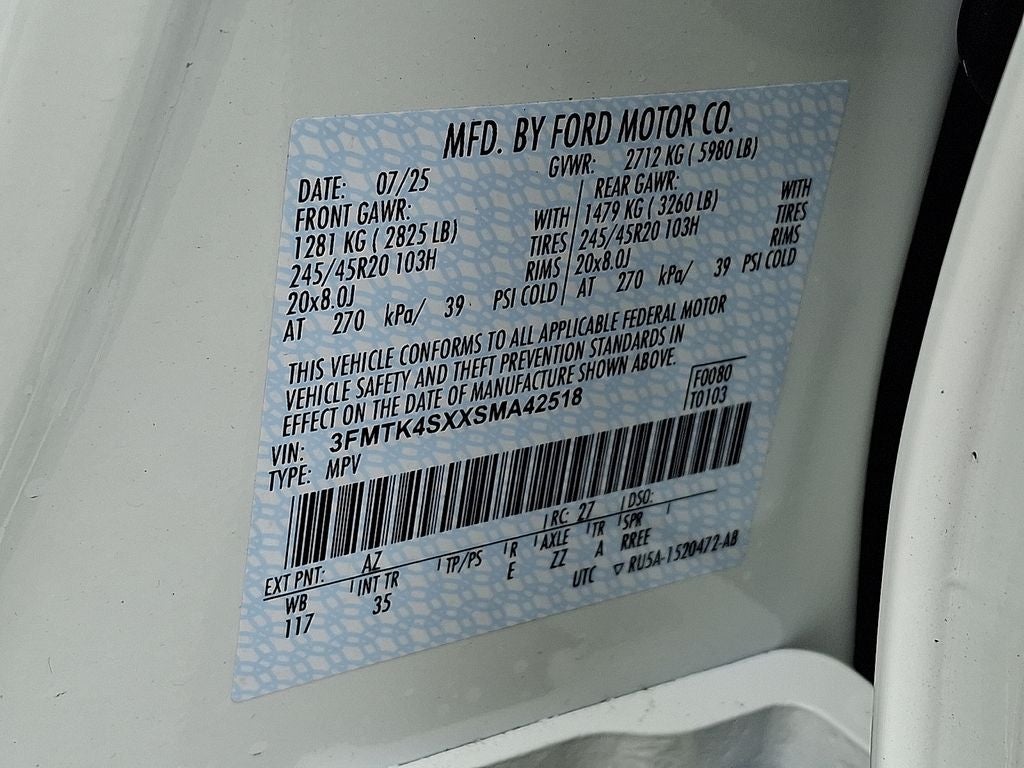 Bronze Appearance Package: Bronze Mesh Front Grille Shield; mach-E 4x Door Badges and Rear Gt Badge. Interior Protection Package: Cargo Floor Liner; Cargo Area Cover; 1st and 2nd Row Floor Liners Without Carpet Mats. Equipment Group 400A Standard Package: Single Speed Transmission; Heated Perforated ActiveX Performance Seats; Dual Motor EAWD (rear/upgraded Front); 20" Monochromatic High Gloss Black-Painted Wheels; 245/45R20 All-Season BSW Tires; B&O Sound System by Bang and Olufsen. Panoramic Fixed-Glass Roof. Star White Metallic TC. Tire Inflator and Sealant Kit. Wheel Lock Kit. Roadside Assist Kit. **Equipment listed is based on original vehicle build and subject to change. Please confirm the accuracy of the included equipment by calling the dealer prior to purchase.**