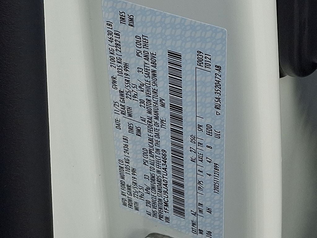 Premium Technology Package: 360-Degree Camera with Split View; ActiveX Trimmed Heated Front Sport Contour Bucket Seats with Quilting Design; B&O Sound System by Bang & Olufsen; Head-Up Display; Front Parking Sensors; Reverse Brake Assist; HD Radio. Equipment Group 601A: 2.0L EcoBoost Engine with Auto Start-Stop Technology; AM/FM Stereo with SiriusXM 360L Radio; Tire Inflator and Sealant Kit; 8-Speed Automatic Transmission; 19" Machined-Face Ebony-Painted Aluminum Wheels; 225/55R19 99H All Season BSW Tires; 4. 760 lbs GVWR. Panoramic Vista Roof. Star White Metallic Tri-Coat. **Equipment listed is based on original vehicle build and subject to change. Please confirm the accuracy of the included equipment by calling the dealer prior to purchase.**