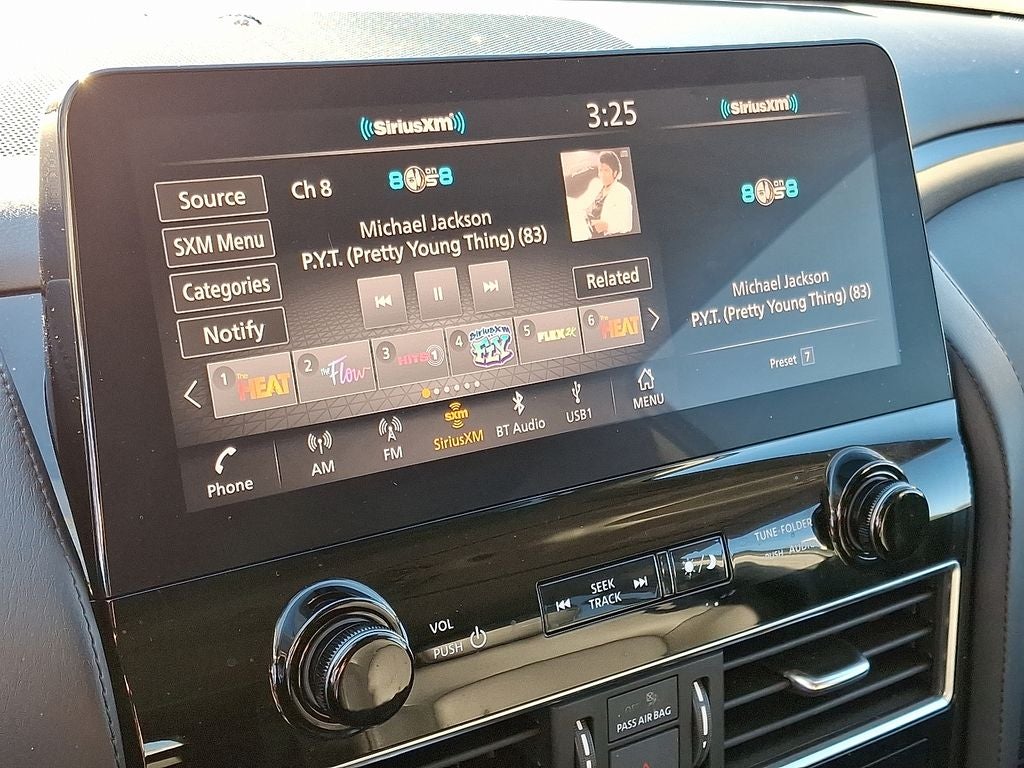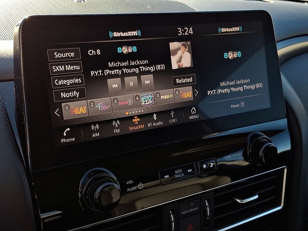 - Radio: NissanConnect w/SiriusXM -inc: 6-speaker audio system, Alexa Built-in, wireless Apple CarPlay, Android Auto, Nissan door to door navigation, 12.3" color display w/multi-touch control, SiriusXM Traffic and Travel Link w/3 month complimentary trial access, NissanConnect services powered by SiriusXM, Bluetooth® hands-free phone system, hands-free text messaging assistant and Wi-Fi hotspot